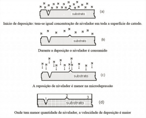 – Niveladores: são responsáveis por possibilitar que microdepressões (ranhuras invisíveis a olho nu) presentes na peça sejam niveladas. Desse modo, as substâncias niveladoras são adsorvidas ao redor das ranhuras, fazendo com que a passagem de corrente elétrica nesses locais de deposição seja menor. Por consequência, a passagem de corrente aumenta nas regiões de depressão, permitindo que os depósitos metálicos se concentrem nesses locais e nivelem a peça. Assim, as ranhuras são preenchidas e a deposição se torna uniforme, garantindo a obtenção de uma peça com aspecto menos irregular e mais brilhante.